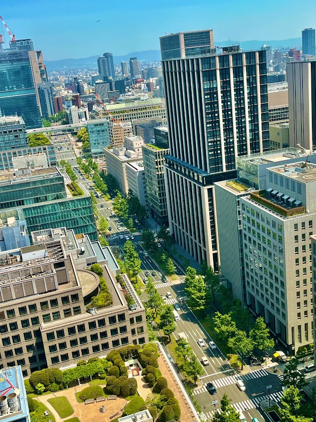 こちらはラウンジから望む、淀屋橋方面。御堂筋やらMUFG大阪本店などが見える。今日は天気がいいな。