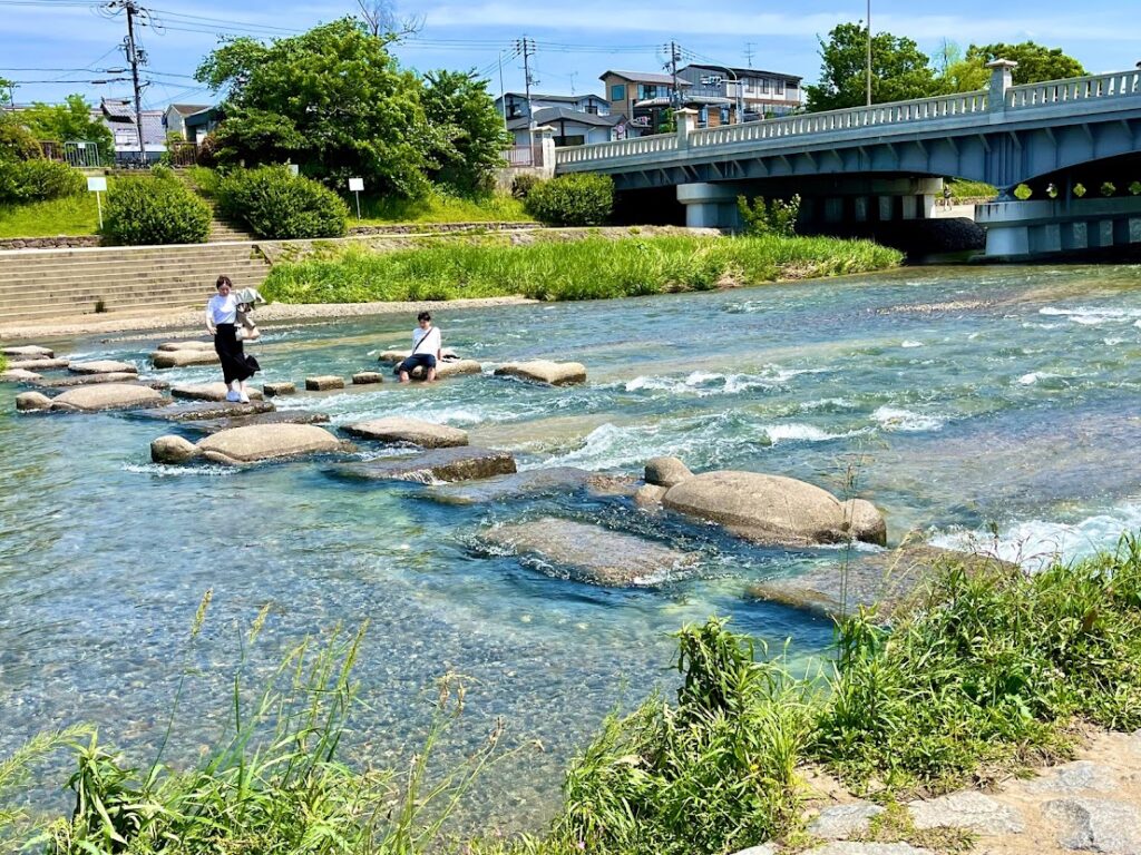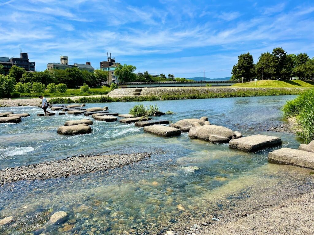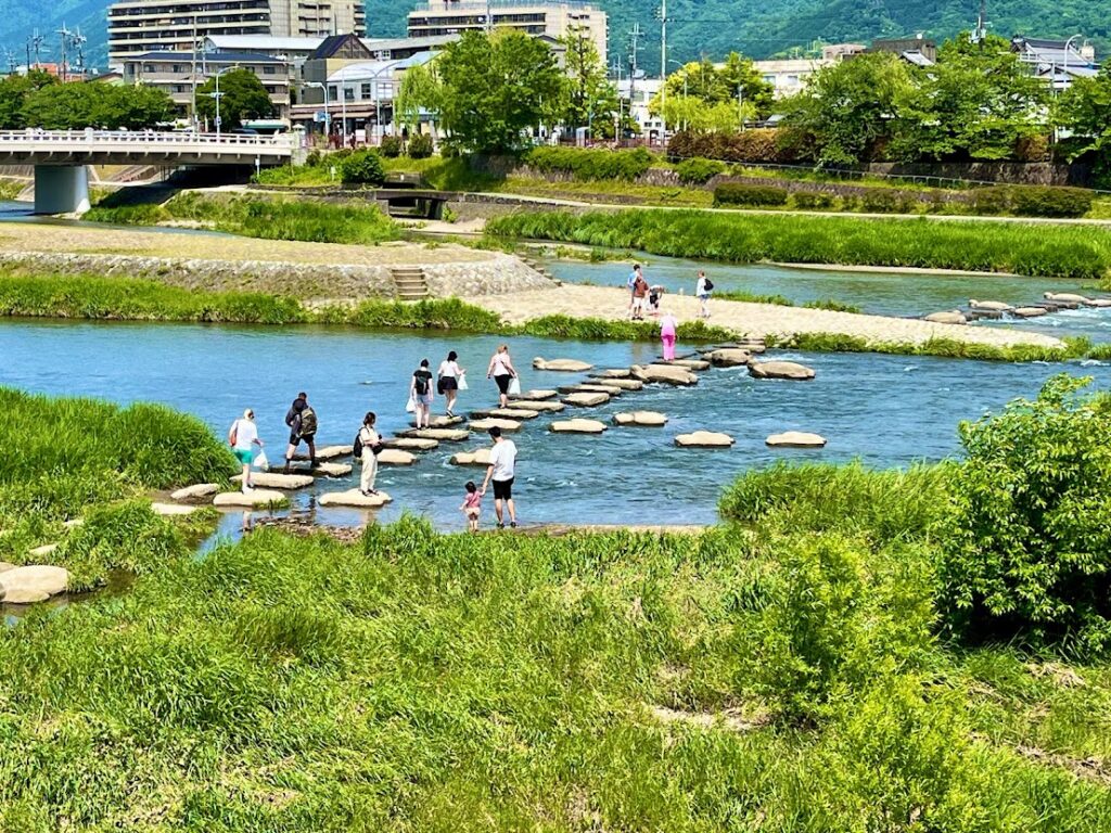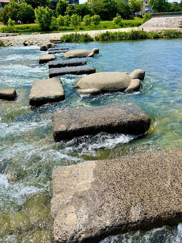 川に降りると、ケンケンと石伝いに対岸に渡れるようになってる。これ以前、私が大阪単身赴任していたころ、冬にやったことがあったが、メチャ寒かった。一方でこの日は京都の気候の特徴もあろうが、暑い!ところが、ケンケンで石伝いに対岸に渡る間は、川の風が涼しくて、快適だった。川の水も透明度が高い。最高だったな。