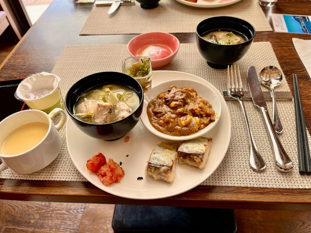 取ってきた朝食。ふぐのみがたっぷり入った(というか自分で入れてきたw)味噌汁。その横は焼カレー。美味しだった。