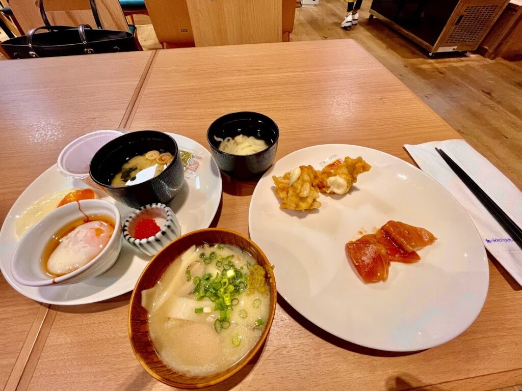ホテルのビュフェ朝餉。昨日の夕餉と同じようなものが中心、あとは鶏天かな。