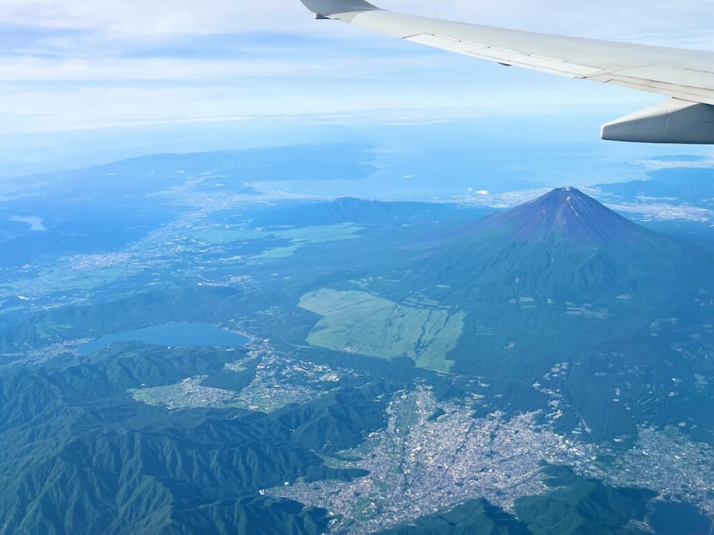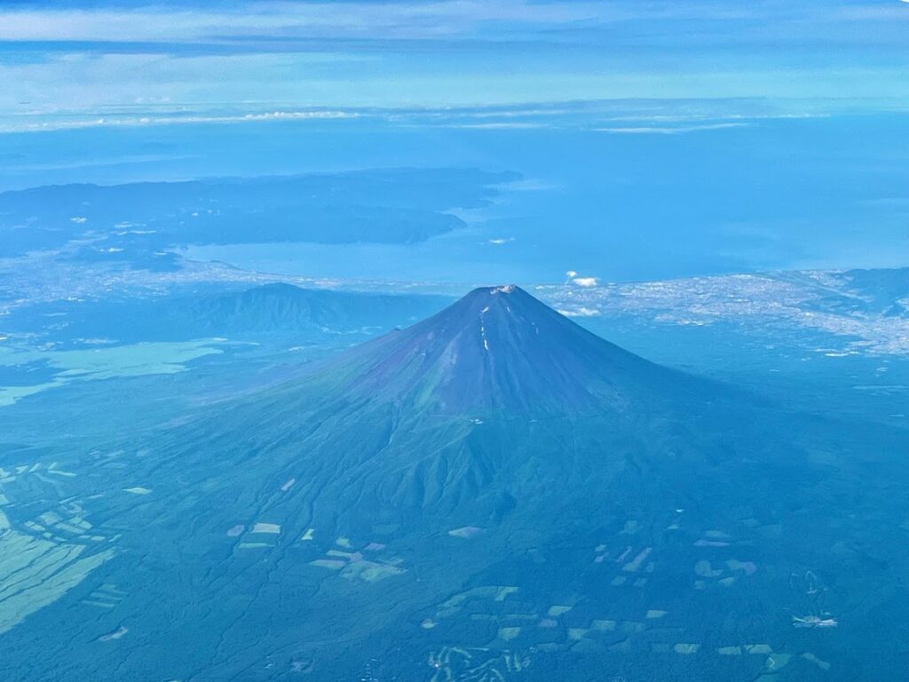 しばらくすると、夏の富士が。上の写真は箱根の芦ノ湖と並んでる。遠くには伊豆半島が。こんな写真、意外に撮れないんだよな。