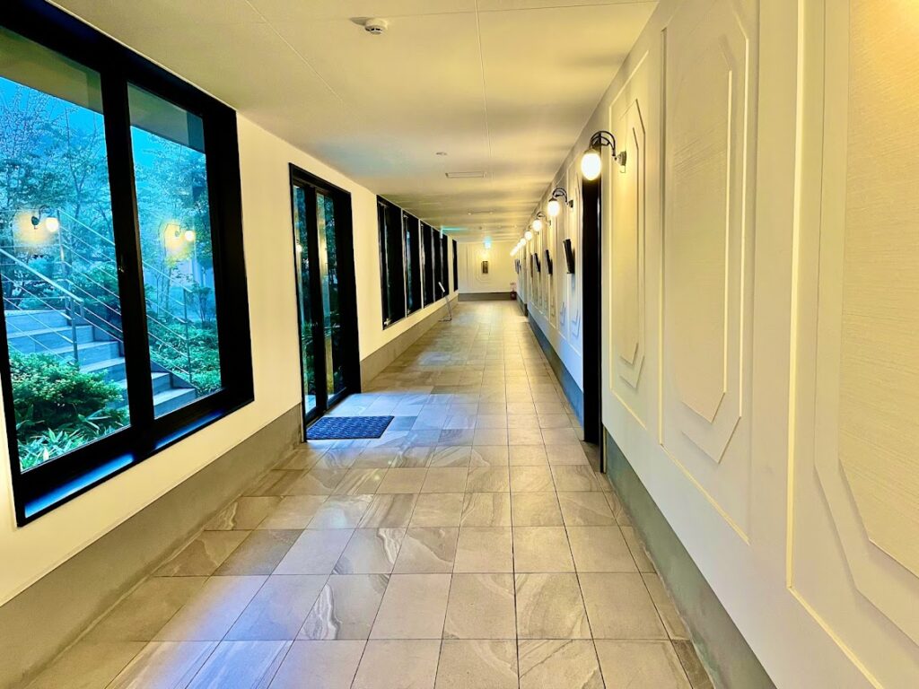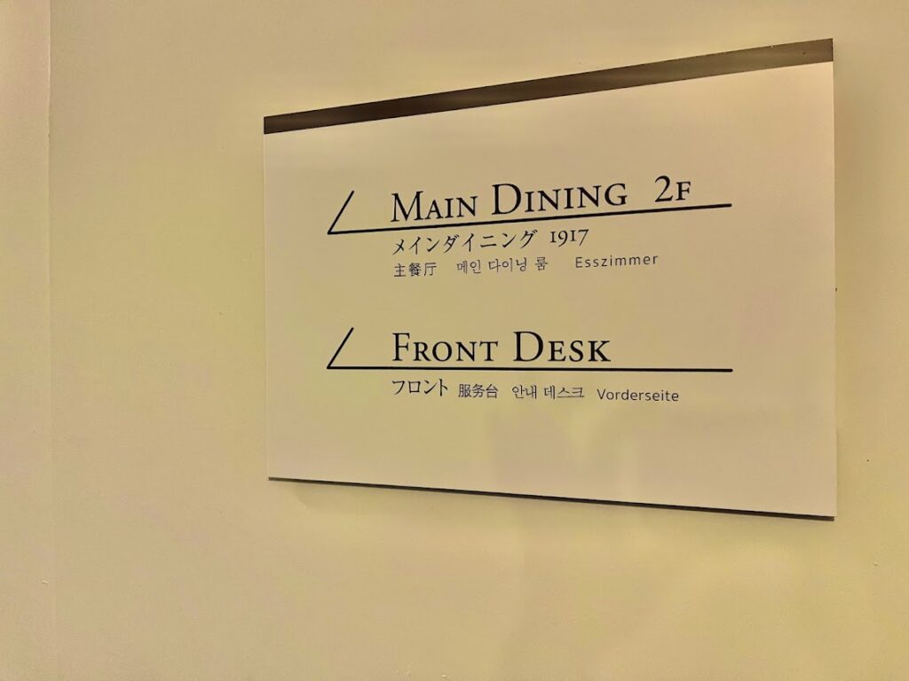 ホテルに戻る。そのまま夕餉会場へ。その廊下や表示も、洗練されてるよな。