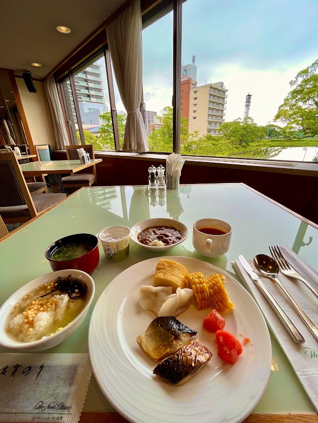 恒例のビュフェ朝餉前の散歩。佐賀城址公園に西門あたりを30分かけて回ったが、特段、映える景色なし。オテルニューオータニ佐賀の写真を撮るのみ。