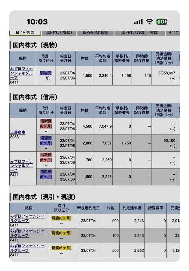 2023年7月4日のデイトレ。本来、信用で売買するべきみずほを間違って現物で売買しているのでわかりづらいが、みずほFG含め、プラスで終わる。まぁまぁかな。