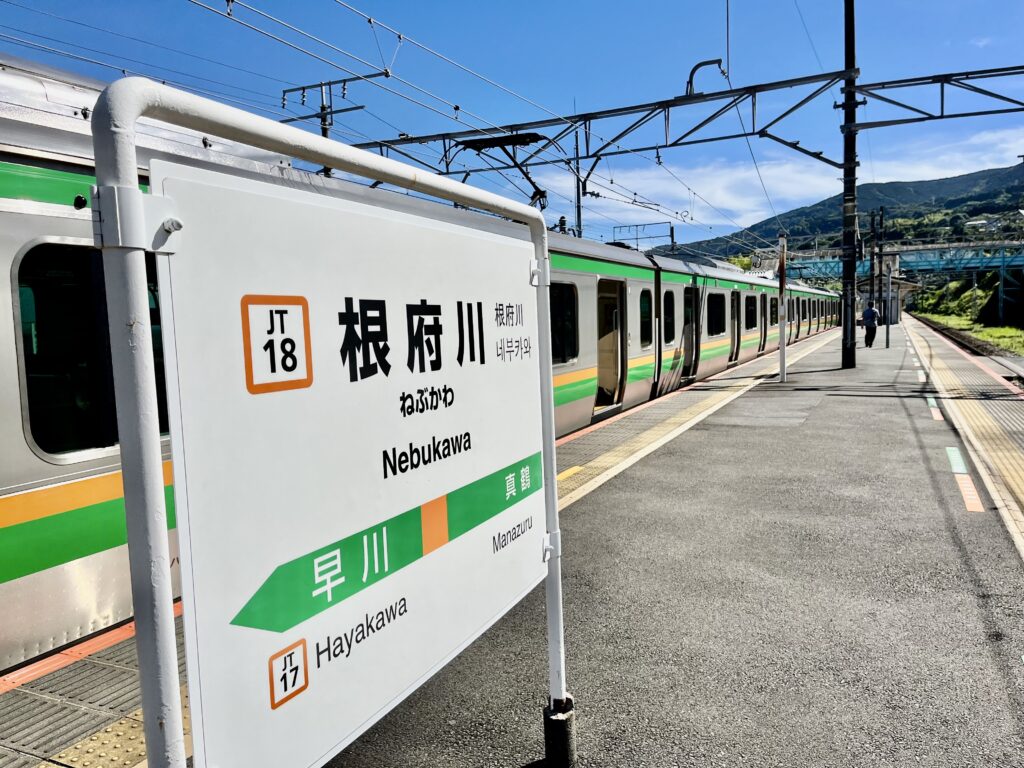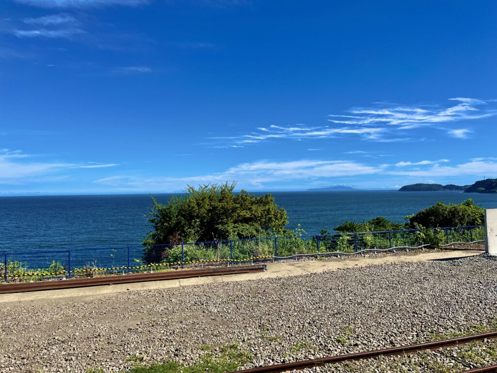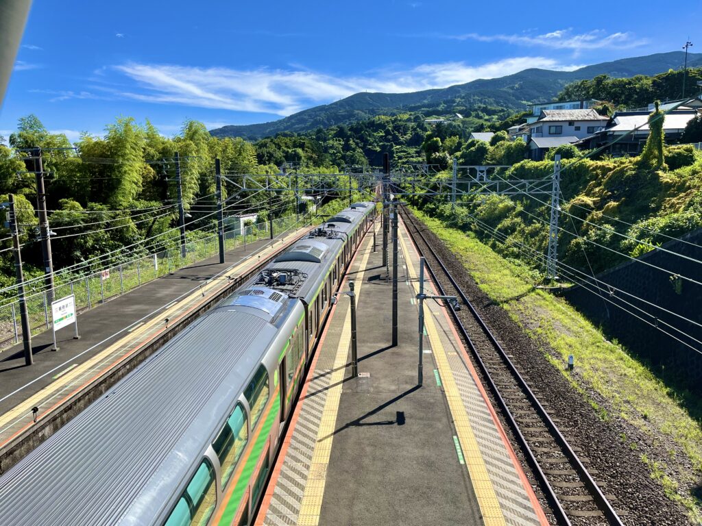 これは東海道線根府川駅という、小田原と熱海の間にある駅。関東で唯一、駅から海が見える。きれいだよな。天気も良い。