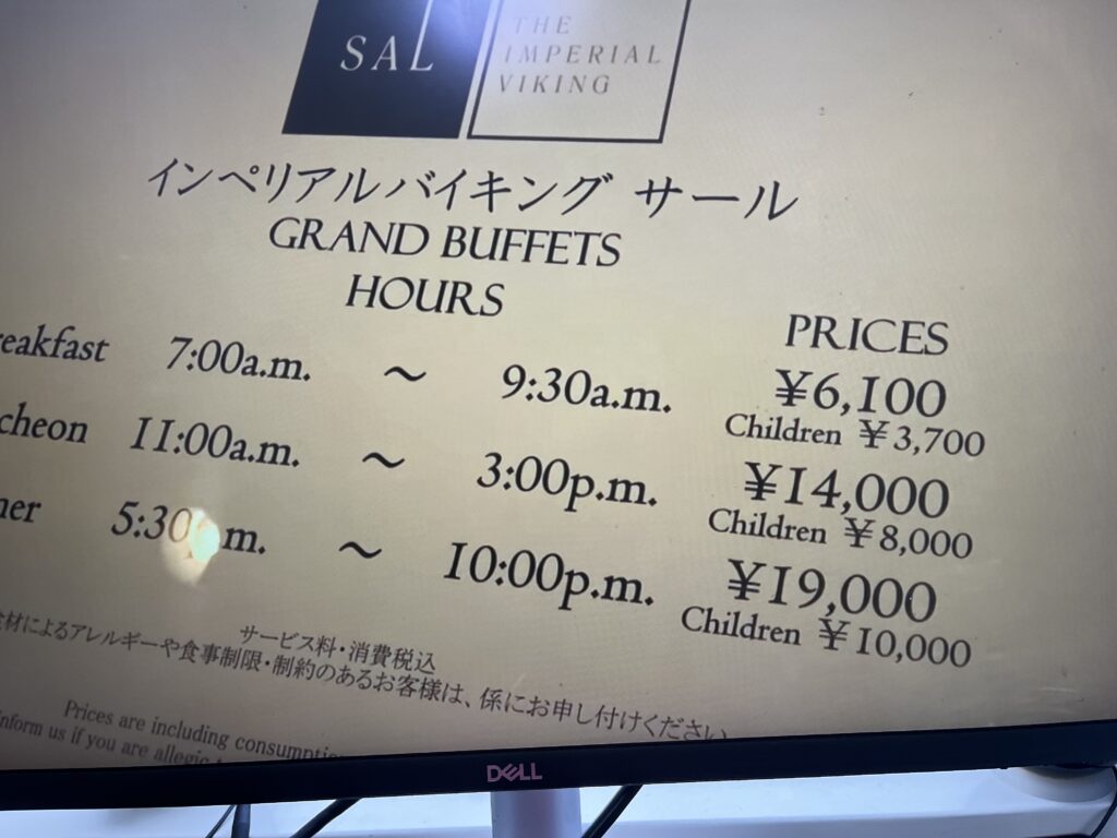 これがビュッフェの料金。私は白テーブルに銀のカトラリー、ボーンチャイナのお皿をしつらえてもらって、セブンイレブンで買い物をして食べますから、食べ物のコストはとんでもなく違う。やっぱりサービスアパートメントにしてよかったなぁ。つくづくそう思いますね。