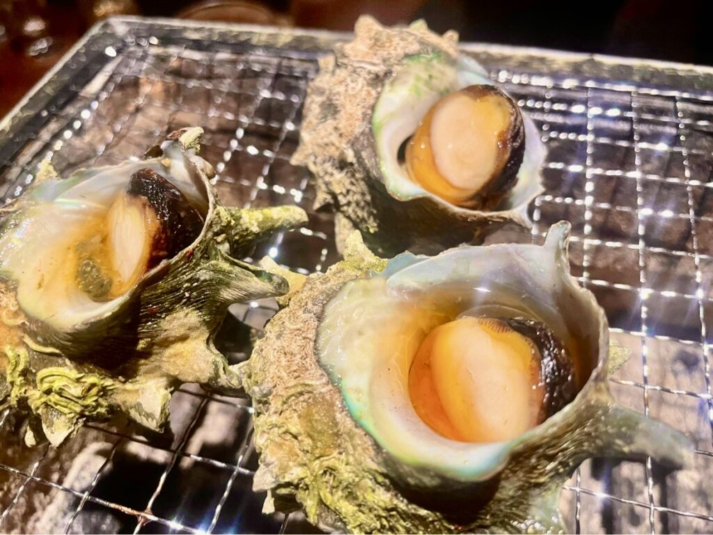 焼きあがったホタテとさざえ。美味しだった。いずれの料理も、ビールとよく合う。