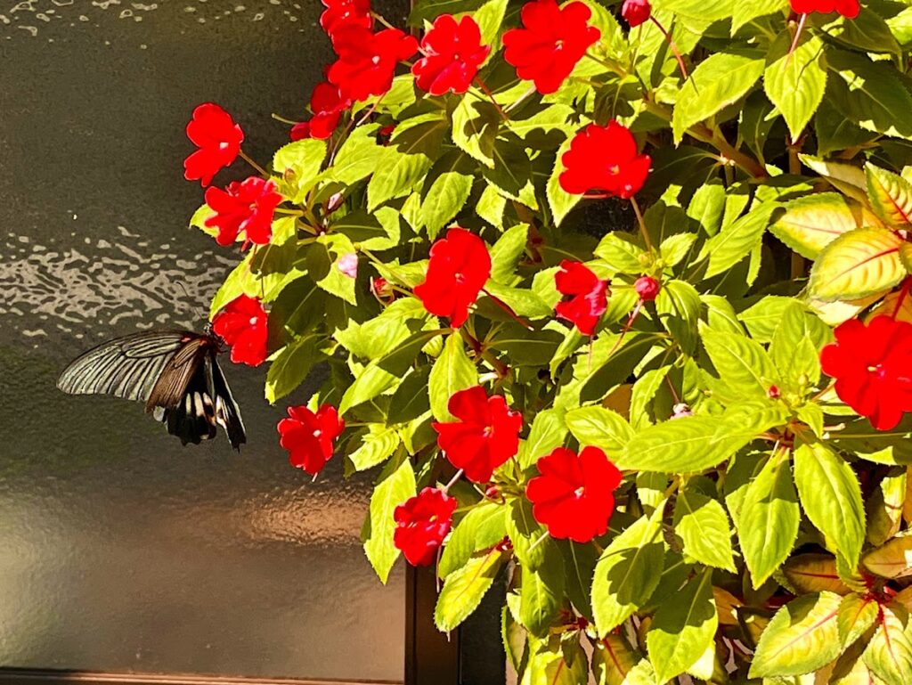 さてさてここでサザエ丼をいただくけれども。食堂の外にあったきれいなお花と、これは黒アゲハかなぁ。きれいだよな。