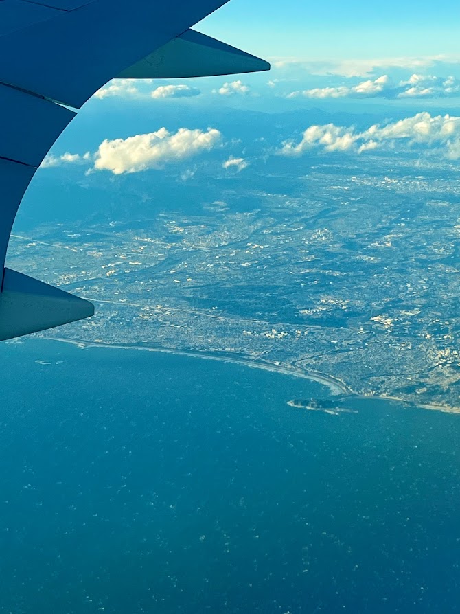 今日のJALは低く飛んでくれた。したがって景色がよく見える。上が横浜ベイブリッジしたが江ノ島。