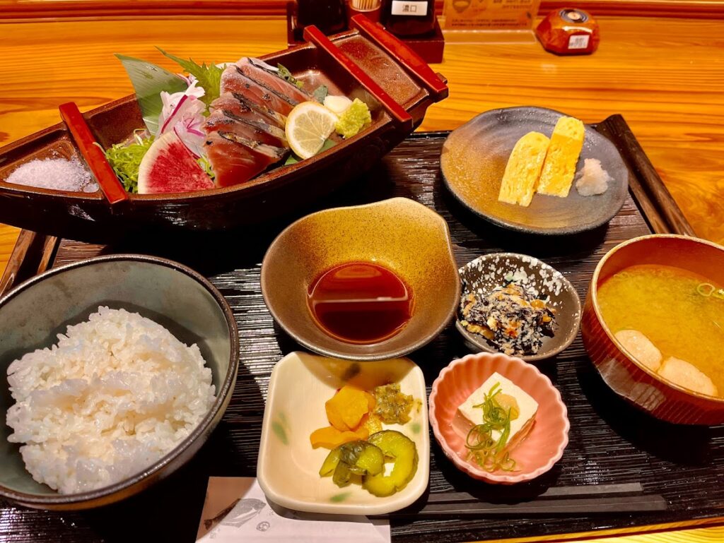 おはようございます。ホテルの朝餉。鰹のタタキ定食をいただく。美味しな。