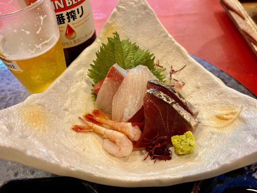 夕餉。まずはお造り。かんぱち、鰹、エビ。美味しかった。ビールとよく合う。