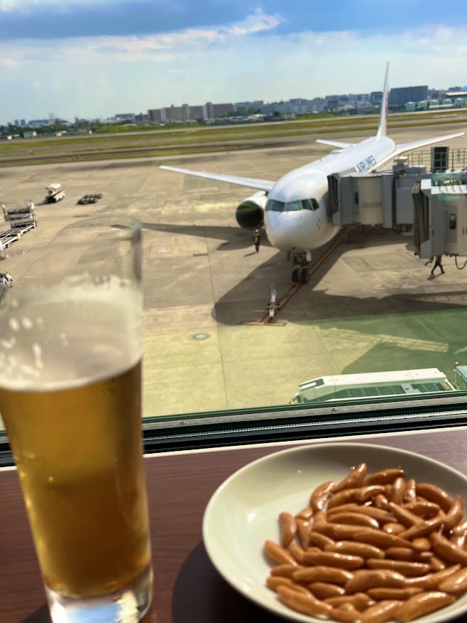 伊丹空港のJALラウンジで、ビールと柿の種をいただく。すると、JALの飛行機がやってきた。