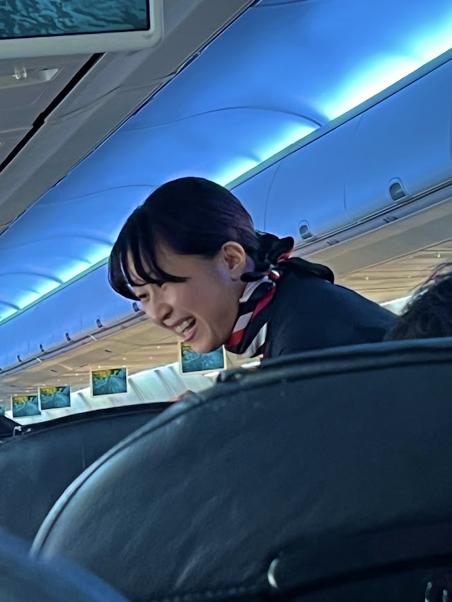 CAさんが子供と話をしていた。なんだかなごやかなムードなので、思わず写真を撮ってしまった。このCAさん、いい笑顔をしてるよな。