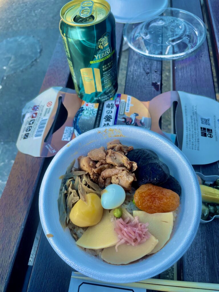 ランチをする場所がない・・・ということで温泉の方と相談したら、おそれくは喫煙所はだれもいないと思うから、そこでゆっくり、どうですかと。実際、どなたもいなくて、ゆっくりと峠の釜めしをビールとともにいただきました。