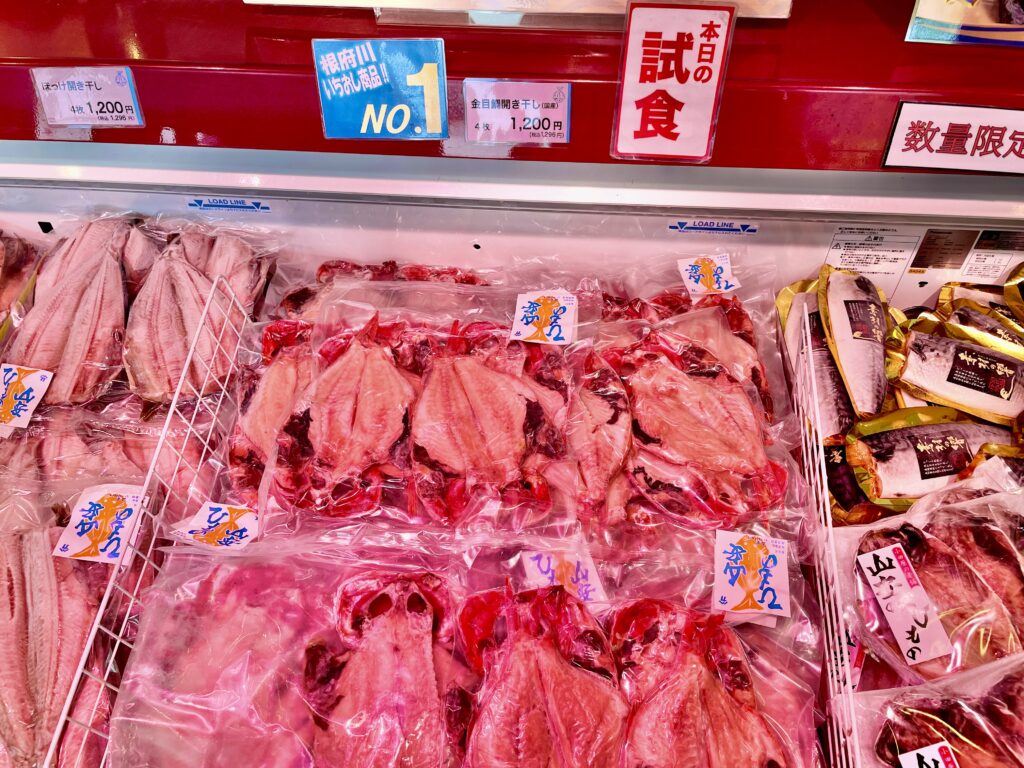 お店に行くと、金目鯛が売っていたけど、こんなにも買うことはできないなぁ。1人では食べれないから試食だけで充分。