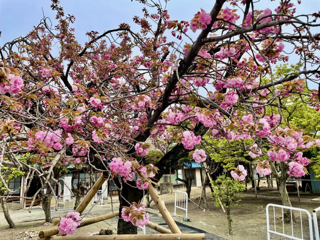 春だ。館内の八重桜と、その近くに植えられていた植物。きれいだよな。