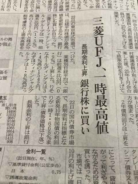 下の三菱UFJの記事。景気回復に伴う緩やかな金利上昇が背景。最近、日本株に伴う環境、実にフォローだよな。喜ばしいことです。