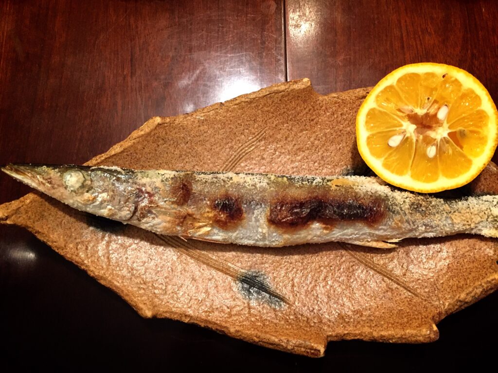 カマスの塩焼き。オレンジ色に熟したカボスでいただく。淡白な味の中にも旨味が。やはりうましだったなぁ。