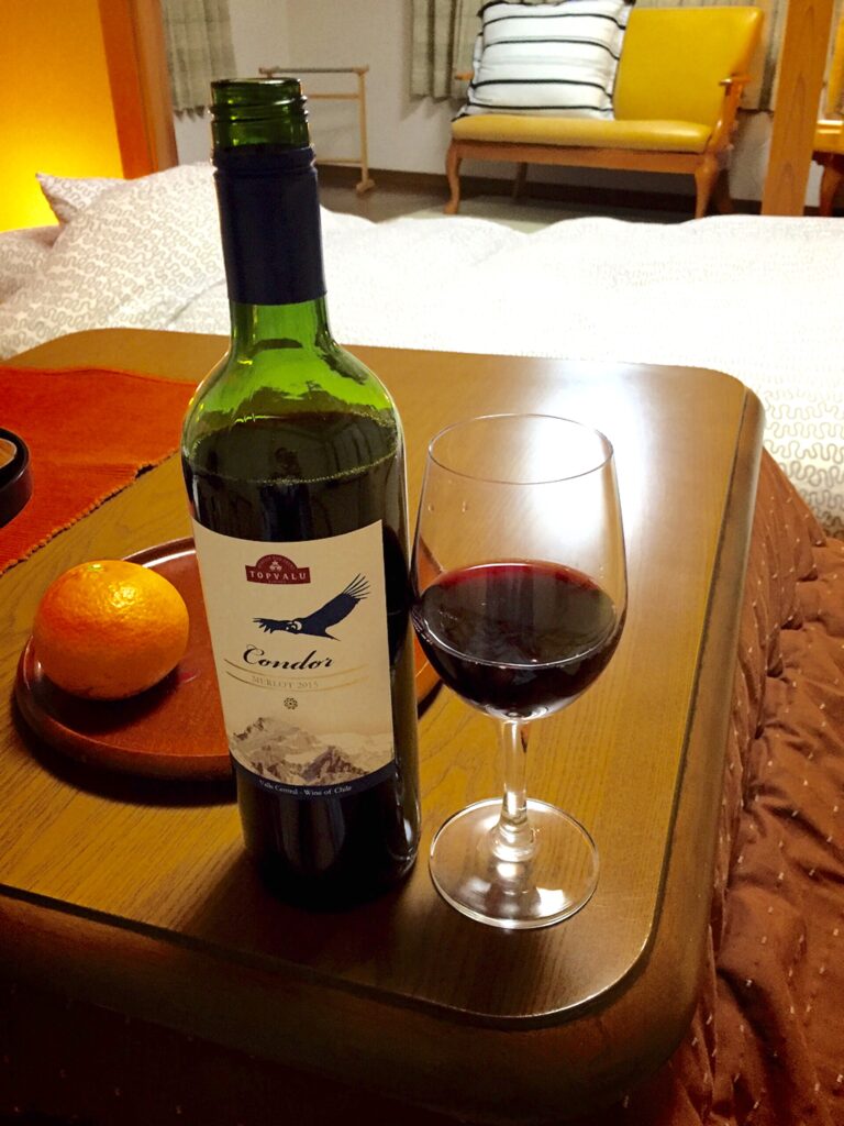 食事が終わり、こたつでワインを。今日はいい日だったなぁ