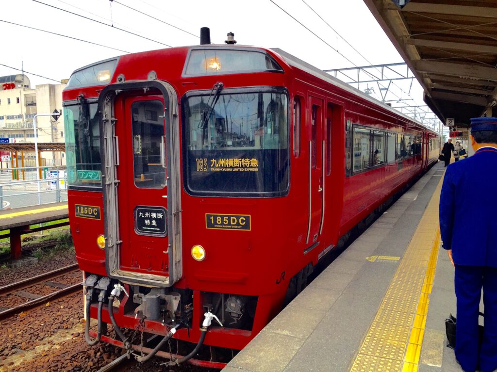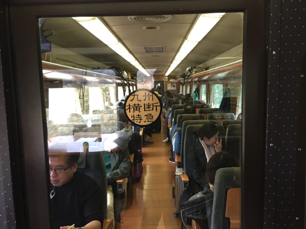 熊本空港に到着。空港からの豊肥本線最寄り駅は、熊本ではなく肥後大津という駅。無料シャトルバスがあるので、それに乗って、この駅まで。肥後大津から大分までは、この九州横断特急で。2両編成の気動車特急だが、この日はほぼ満席だった。外見・車内とも、JR九州の世界。乗客の半分は、阿蘇駅で降りていった。阿蘇観光が目的なんだな。