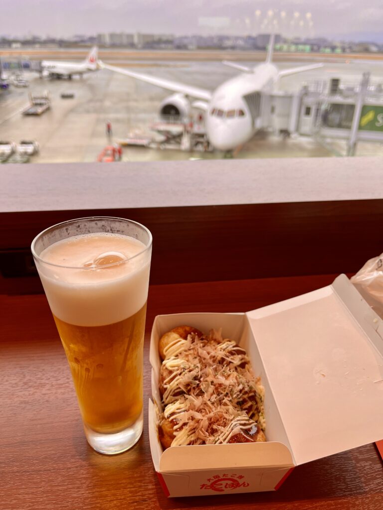 ここは伊丹空港JALさくらラウンジ。ここでビールとたこ焼きが今日のランチ。美味しな。
